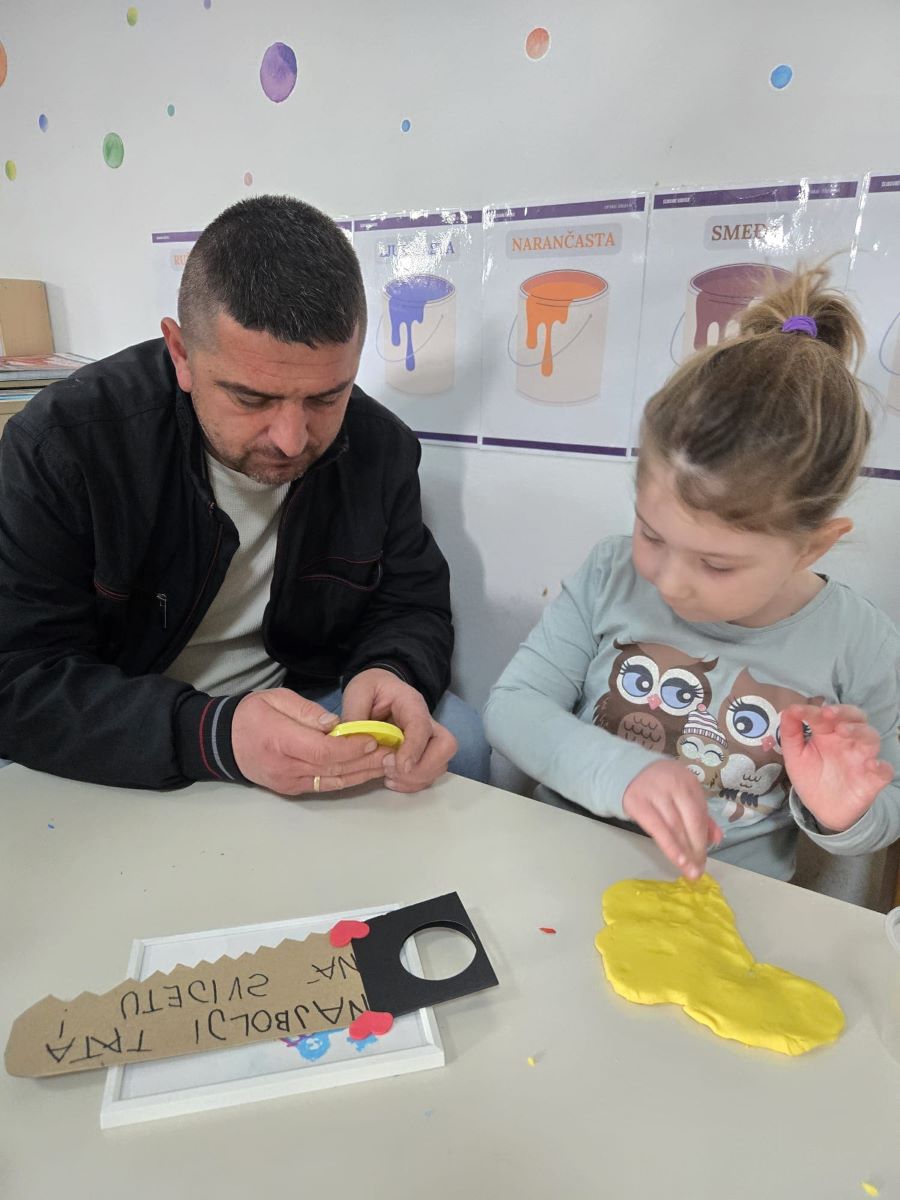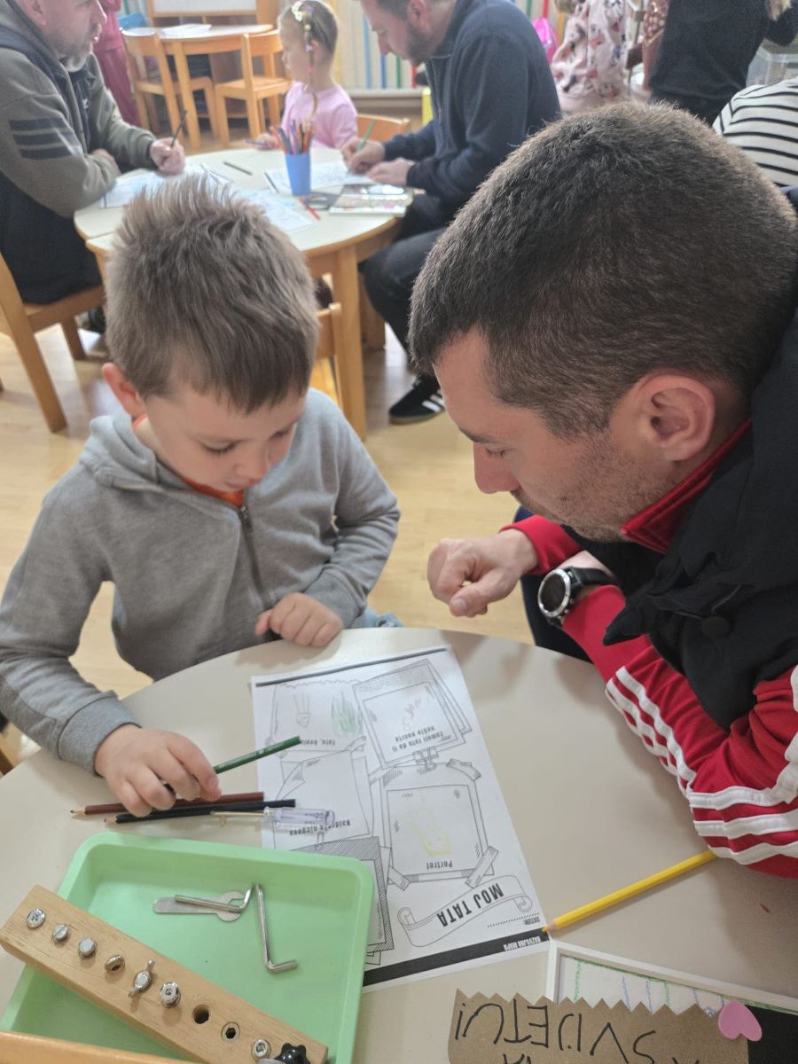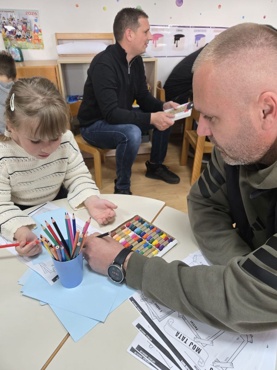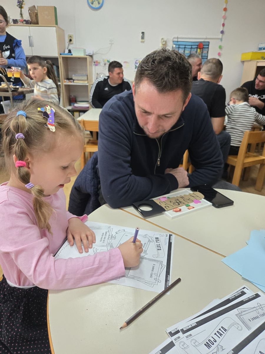 Dana 19. ožujka 2026. godine u popodnevnim satima u Dječjem vrtiću Suhopolje skupina Točkice obilježila je Dan očeva prigodnom igraonicom i zajedničkim druženjem djece i njihovih očeva. Dan očeva u našem vrtiću tradicionalno obilježavamo s ciljem jačanja obiteljskih veza i poticanja aktivnog uključivanja očeva u odgojno-obrazovni proces. Očevi su se rado odazvali našem pozivu te smo susret započeli ugodnim druženjem i zakuskom u sobi dnevnog boravka, stvarajući poticajno i opušteno ozračje. Djeca su svojim očevima pripremila kratki prigodni program – recitirala su pjesmice i stihove te im uručila vlastoručno izrađene čestitke i darove kao znak ljubavi i zahvalnosti. U nastavku druženja očevi i djeca sudjelovali su u zajedničkim likovnim aktivnostima i društvenim igrama koje su poticale suradnju, međusobno uvažavanje i timski duh. Završni dio susreta proveli smo na dvorištu vrtića, gdje su očevi i djeca kroz sportske aktivnosti, igru nogometa i slobodnu igru na spravama dodatno učvrstili međusobne odnose. Kroz kretanje i zajedničku igru poticali smo razvoj motoričkih sposobnosti, socijalnih vještina i pozitivne slike o sebi. Ovakva druženja imaju posebnu vrijednost jer doprinose osjećaju pripadnosti, sigurnosti i zajedništva te stvaraju lijepe uspomene koje djeca nose sa sobom.