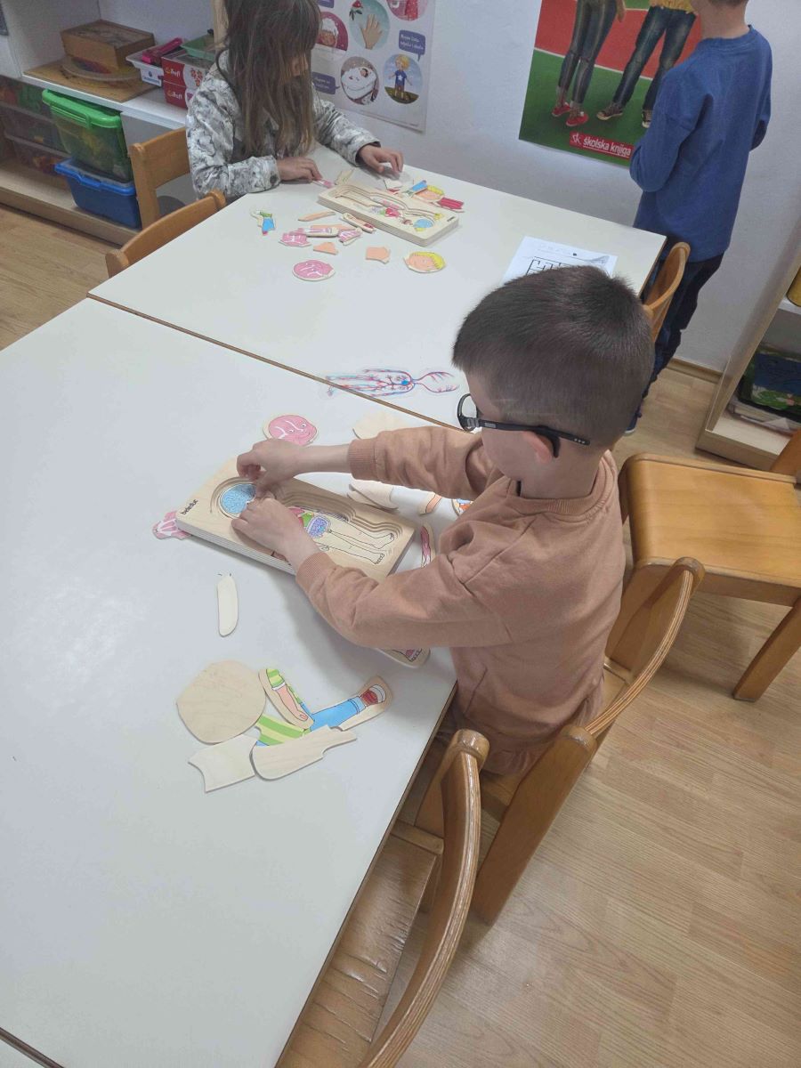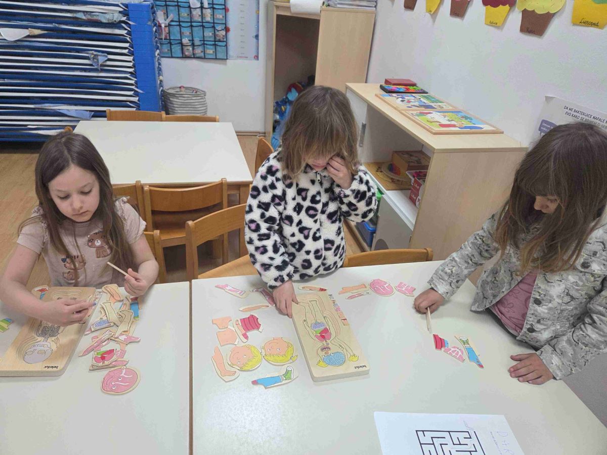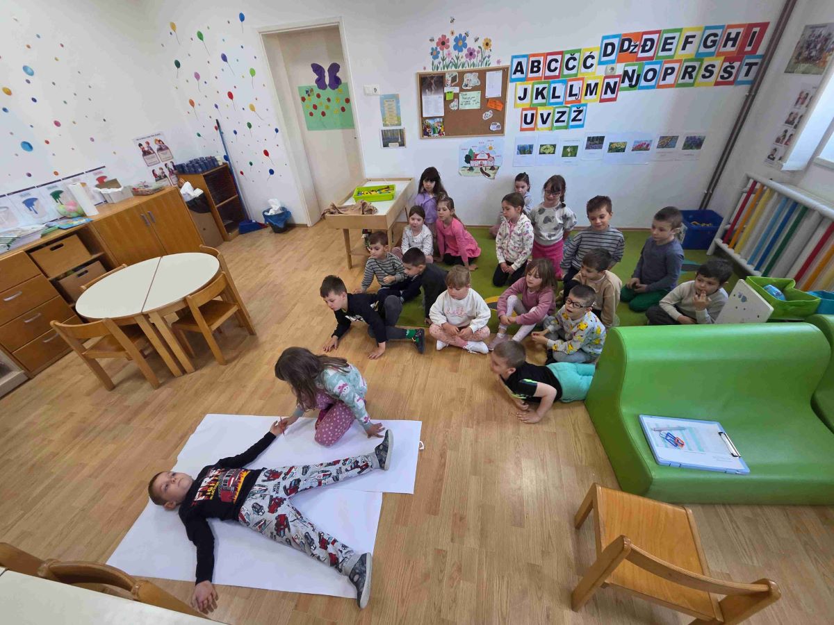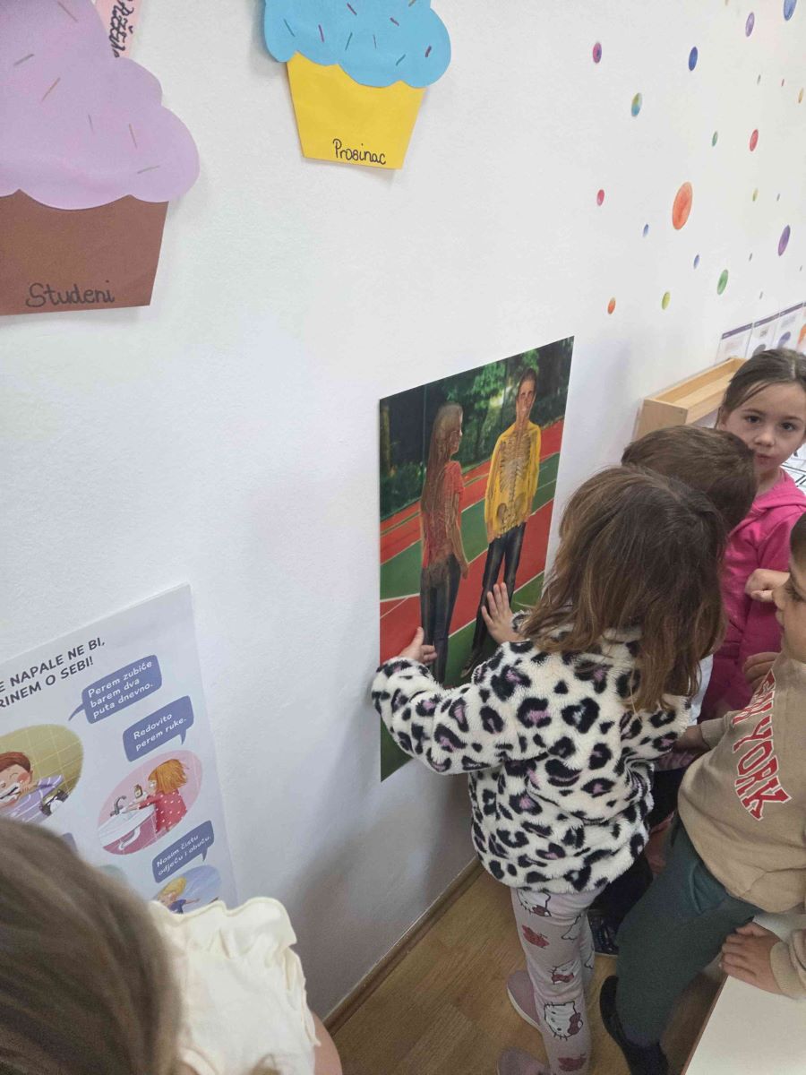 Kroz igre i didaktičke materijale djeca su upoznavala ljudsko tijelo i važnost očuvanja zdravlja. Slagala su puzzle i slagalice na temu tijela, sudjelovala u predmatematičkim aktivnostima sastavljanja ljudskog tijela pomoću geometrijskih likova te kroz razgovor učila o dijelovima tijela i njihovim funkcijama. Mjerenjem visine međusobno su uspoređivala rezultate, čime su razvijala matematičke i socijalne vještine. Posebno zanimljiva bila je pokretna igra „Obrnuti zadaci“, koja je poticala pažnju, snalažljivost i tjelesnu aktivnost. Djeca su također ocrtavala vlastito tijelo te crtala unutarnje organe, a sve je objedinjeno izradom zajedničkog plakata. Kroz sve aktivnosti djeca su razvijala spoznajne, motoričke i socio-emocionalne vještine, jačala svijest o važnosti zdravlja te s veseljem istraživala svijet oko sebe.