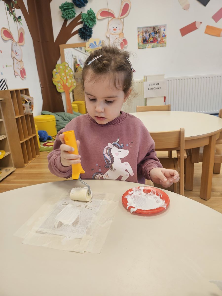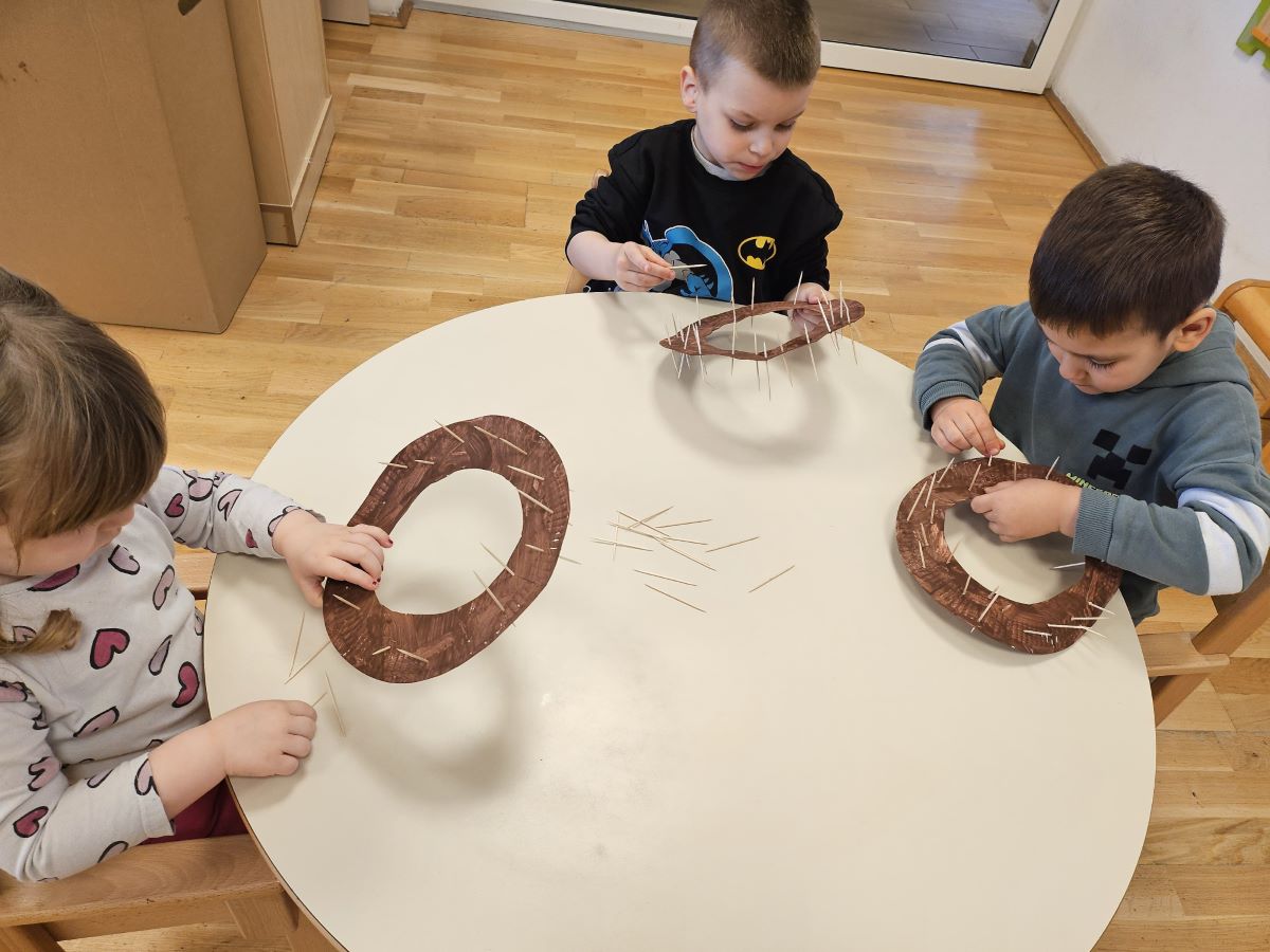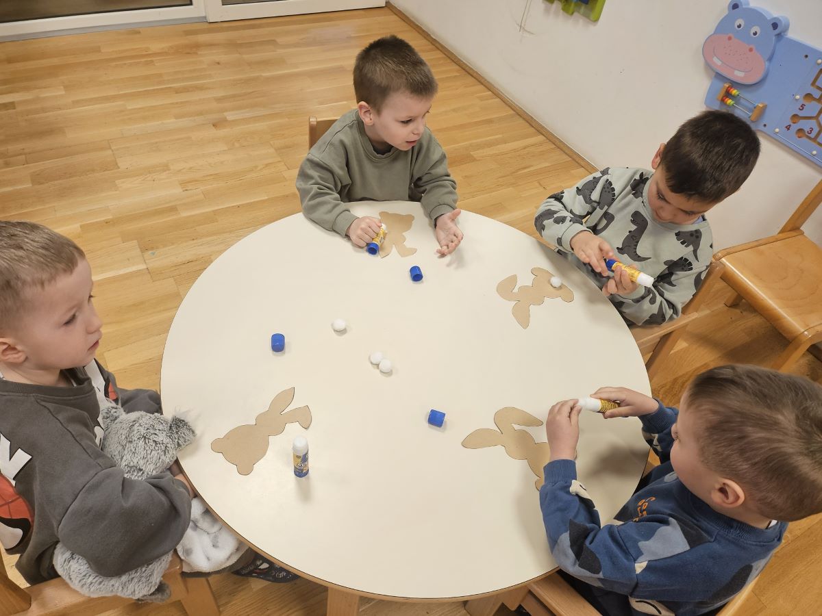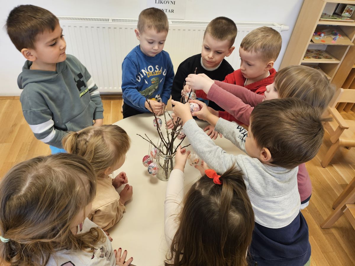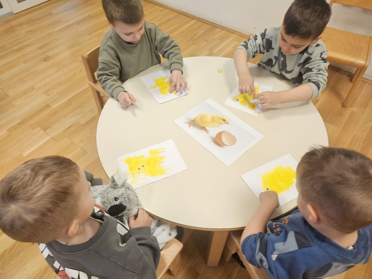 U našoj jasličkoj skupini „Zečići“ protekli su dani bili u znaku priprema za Uskrs. Kroz igru, razgovor i razne aktivnosti djeca su upoznavala uskrsne običaje i tradiciju. Vrijedne male ruke ukrašavale su i izrađivale uskrsna jaja različitim tehnikama, a s velikim su veseljem izrađivala i uskrsne čestitke za svoje najmilije. U šetnji okolicom djeca su brala travu od koje smo zajedno napravili uskrsno gnijezdo. Kroz razgovor smo djeci na njima primjeren način približili priču o Isusovoj muci i uskrsnuću, a tom prilikom izrađivali smo i krunu od trnja. Naše aktivnosti upotpunila je i izrada pilića i zečića, koji su dodatno uljepšali prostor naše skupine i donijeli pravi uskrsni ugođaj. Uz sve pripreme za Uskrs, u našoj smo skupini proslavili i rođendan, pa je tjedan bio ispunjen veseljem, pjesmom i smijehom. Kroz sve aktivnosti djeca su razvijala kreativnost, zajedništvo i radost stvaranja, a naš vrtić bio je ispunjen toplinom i uskrsnim veseljem.