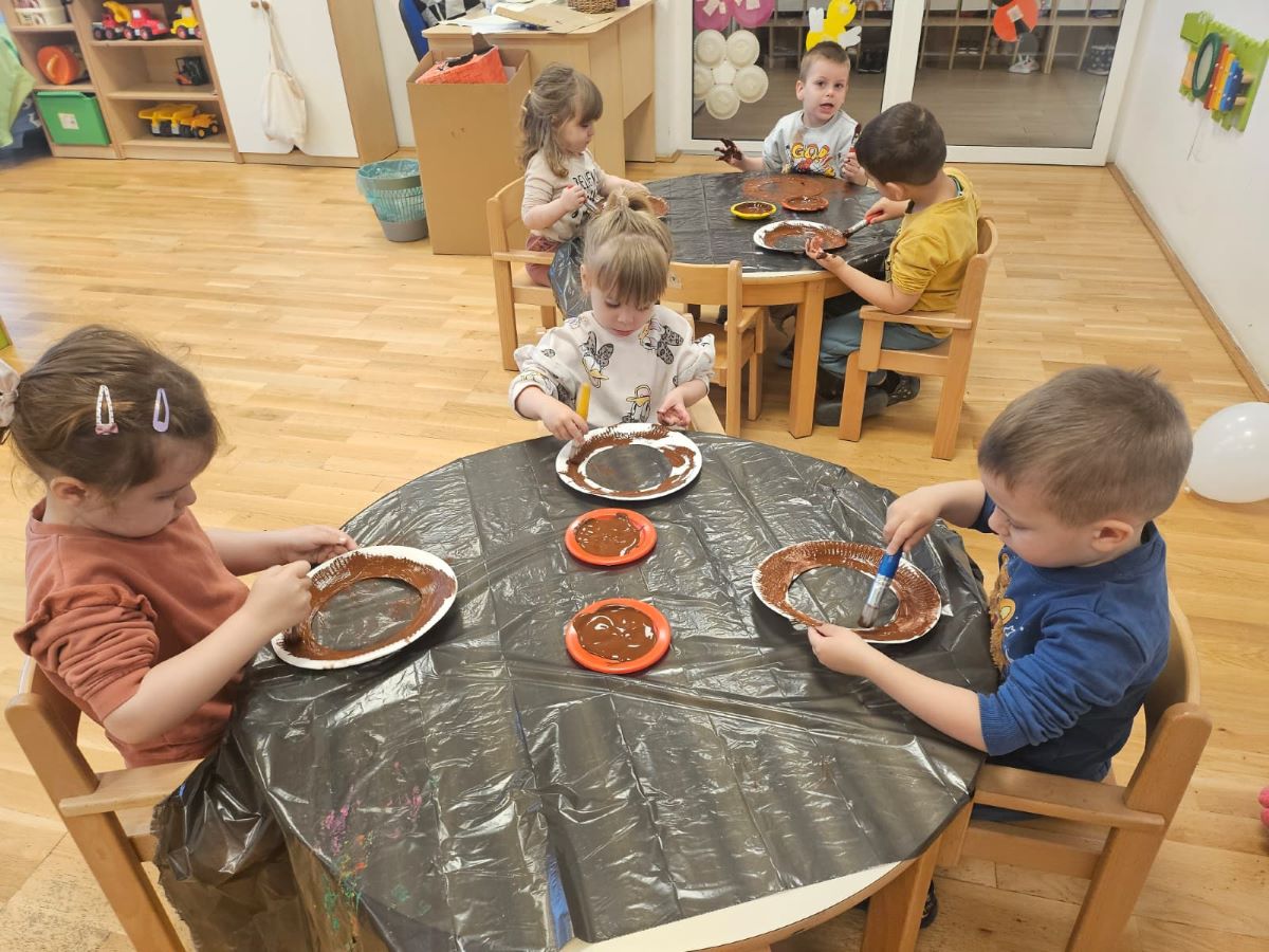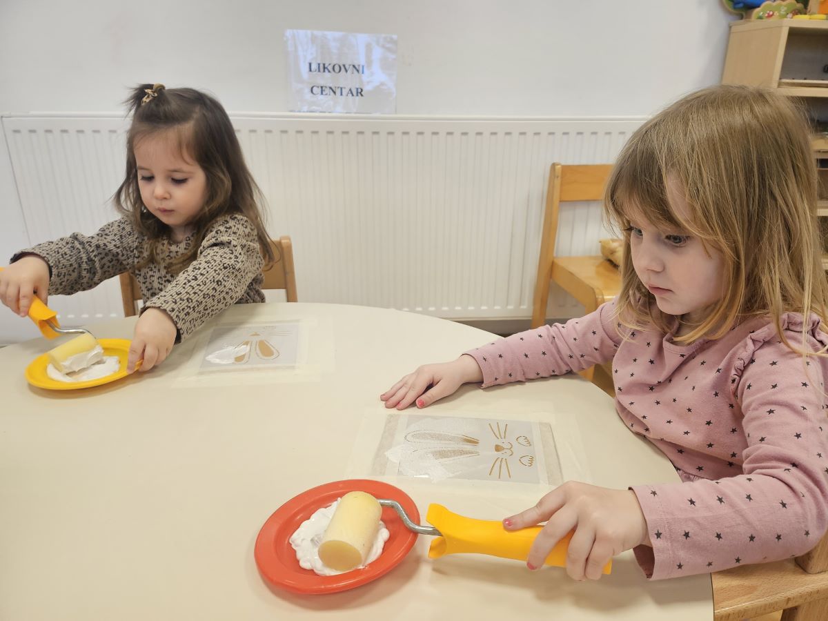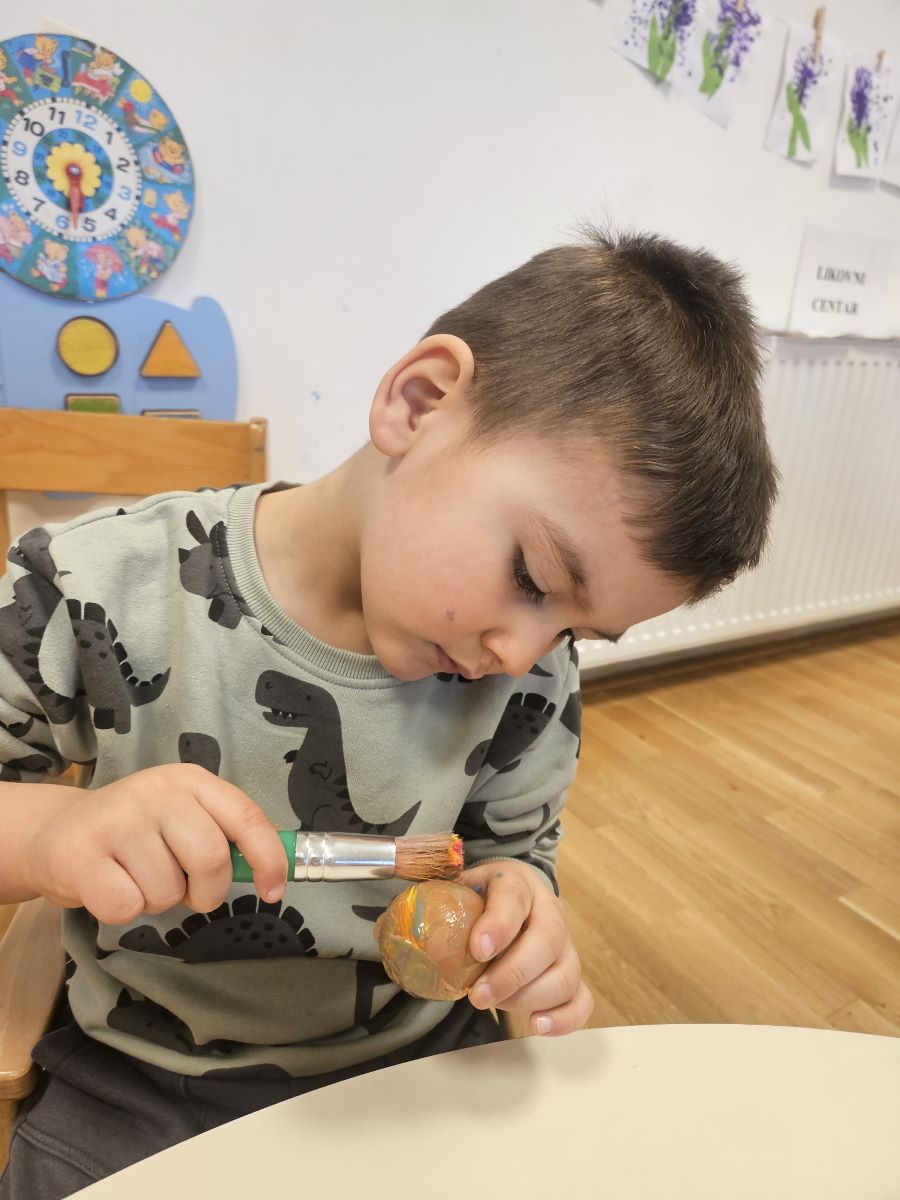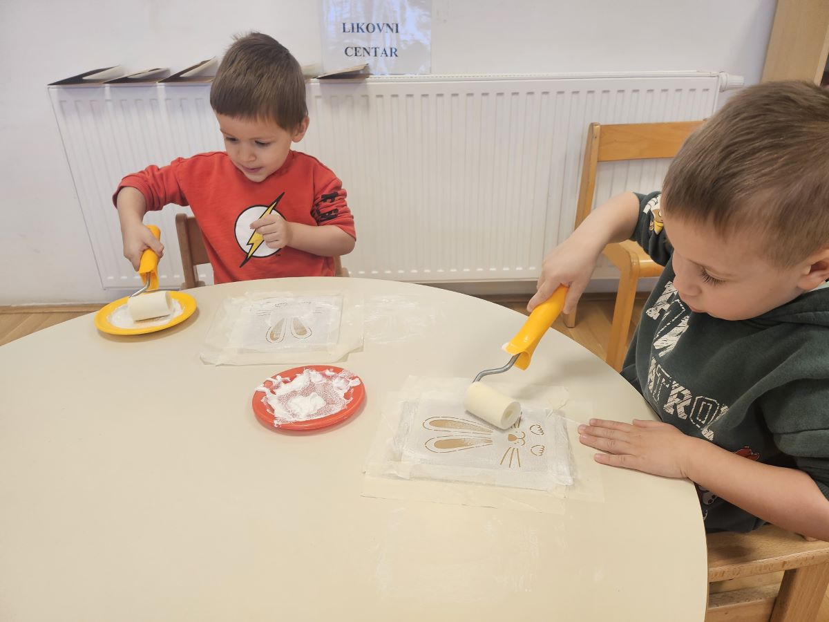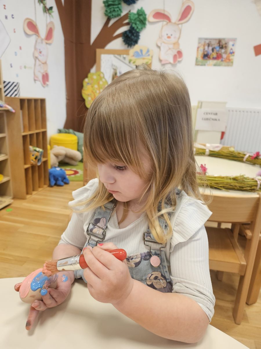 U našoj jasličkoj skupini „Zečići“ protekli su dani bili u znaku priprema za Uskrs. Kroz igru, razgovor i razne aktivnosti djeca su upoznavala uskrsne običaje i tradiciju. Vrijedne male ruke ukrašavale su i izrađivale uskrsna jaja različitim tehnikama, a s velikim su veseljem izrađivala i uskrsne čestitke za svoje najmilije. U šetnji okolicom djeca su brala travu od koje smo zajedno napravili uskrsno gnijezdo. Kroz razgovor smo djeci na njima primjeren način približili priču o Isusovoj muci i uskrsnuću, a tom prilikom izrađivali smo i krunu od trnja. Naše aktivnosti upotpunila je i izrada pilića i zečića, koji su dodatno uljepšali prostor naše skupine i donijeli pravi uskrsni ugođaj. Uz sve pripreme za Uskrs, u našoj smo skupini proslavili i rođendan, pa je tjedan bio ispunjen veseljem, pjesmom i smijehom. Kroz sve aktivnosti djeca su razvijala kreativnost, zajedništvo i radost stvaranja, a naš vrtić bio je ispunjen toplinom i uskrsnim veseljem.