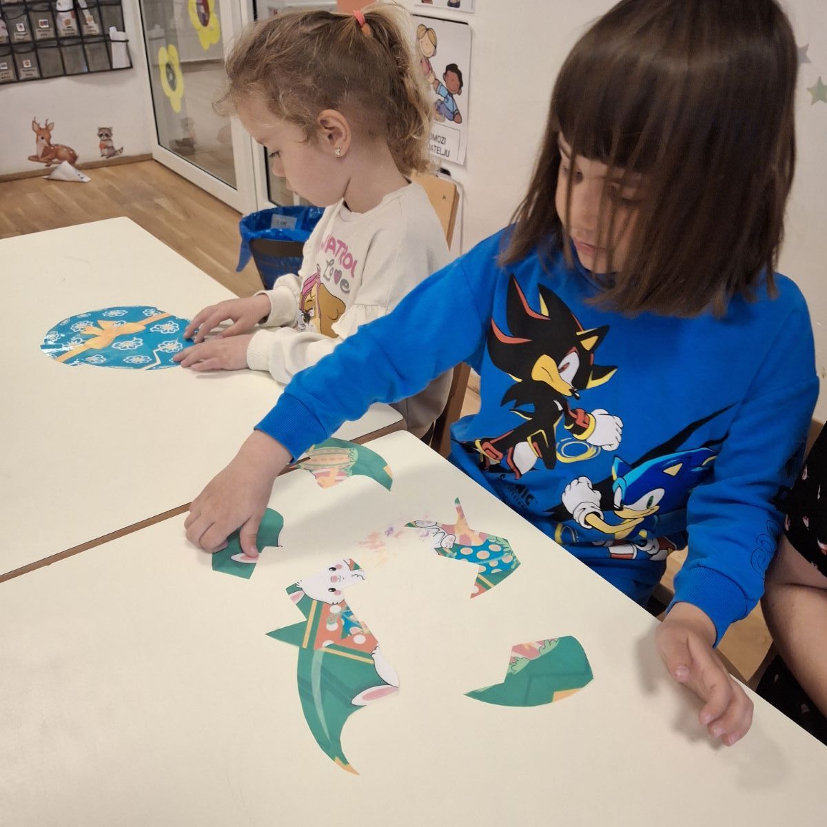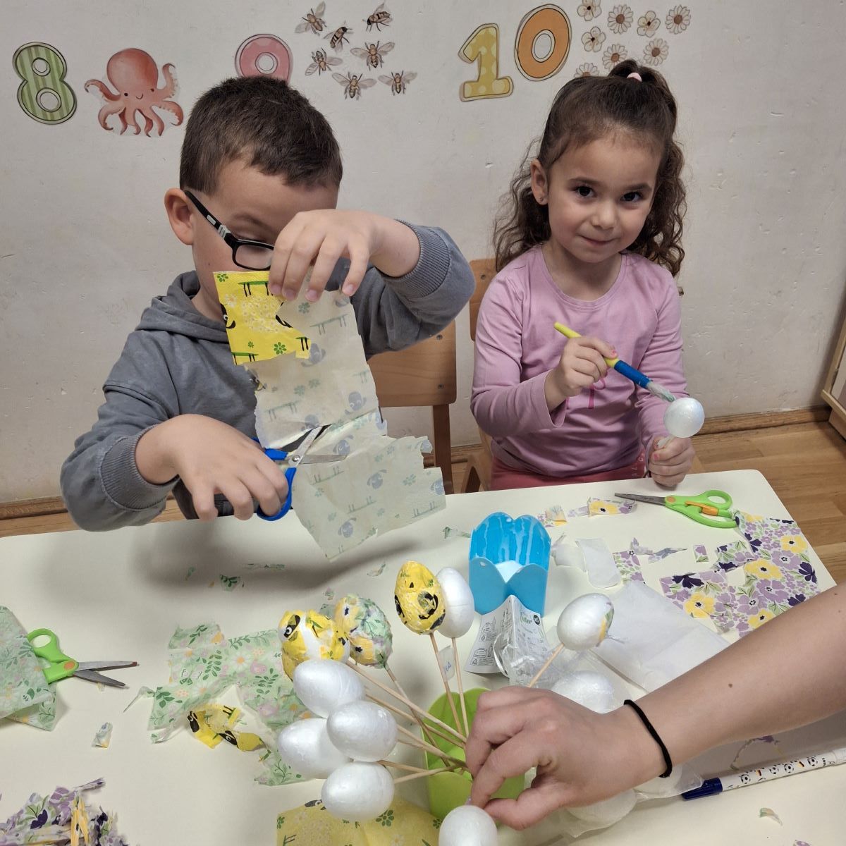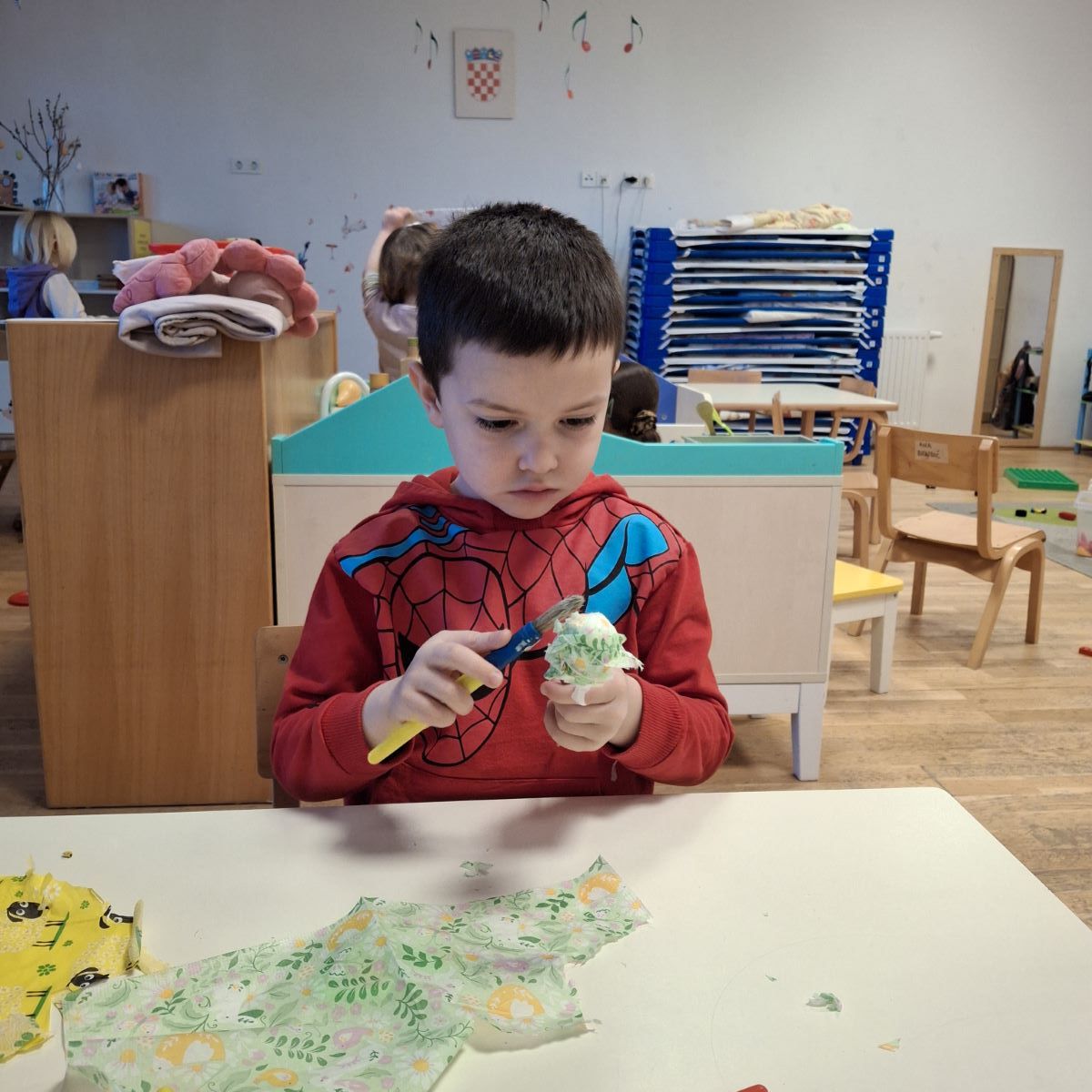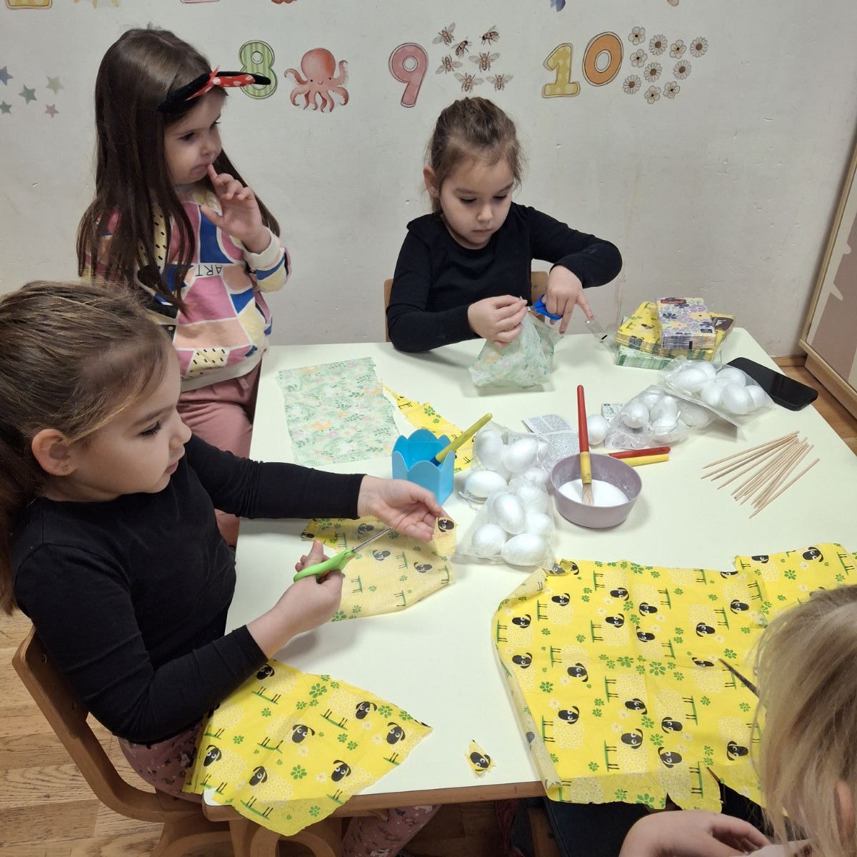 U našoj skupini “Iskrice” proteklo razdoblje bilo je ispunjeno radošću, kreativnošću i veseljem uoči nadolazećeg Uskrsa. Djeca su s velikim zanimanjem sudjelovala u raznim Uskrsnim aktivnostima. Posebno ih je razveselilo bojanje jaja, koja su sami donesli. Ove godine smo se odlučili za bojanje raznobojnim krep papirom koji smo močili u vodu s octom. U likovnom centru okušali smo se i u dekupaž tehnici, razvijajući finu motoriku i osjećaj za estetiku. Kroz radne listove, Iskrice su učvršćivale svoje spoznaje, vježbale pažnju i logičko razmišljanje, dok su kroz razgovor i slikovnice upoznavali običaje vezane za Uskrs.