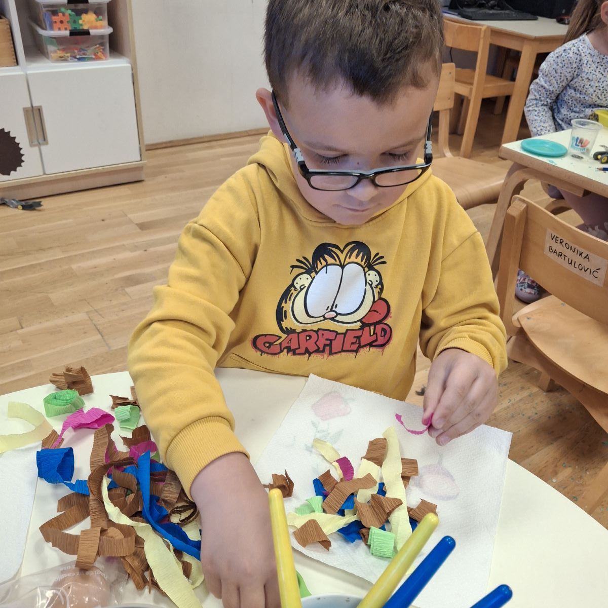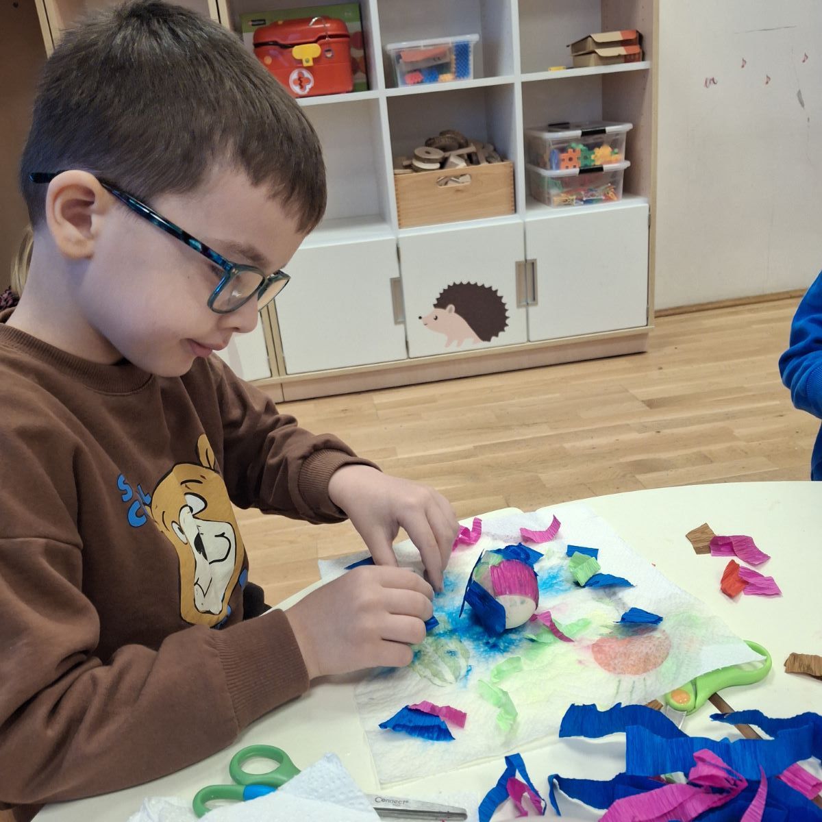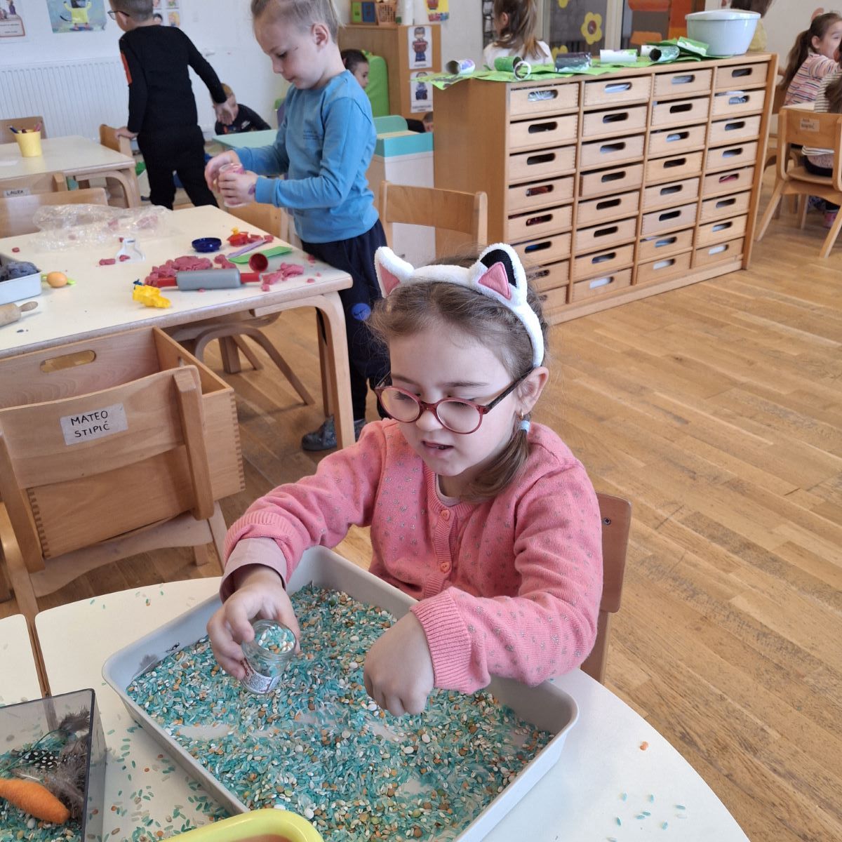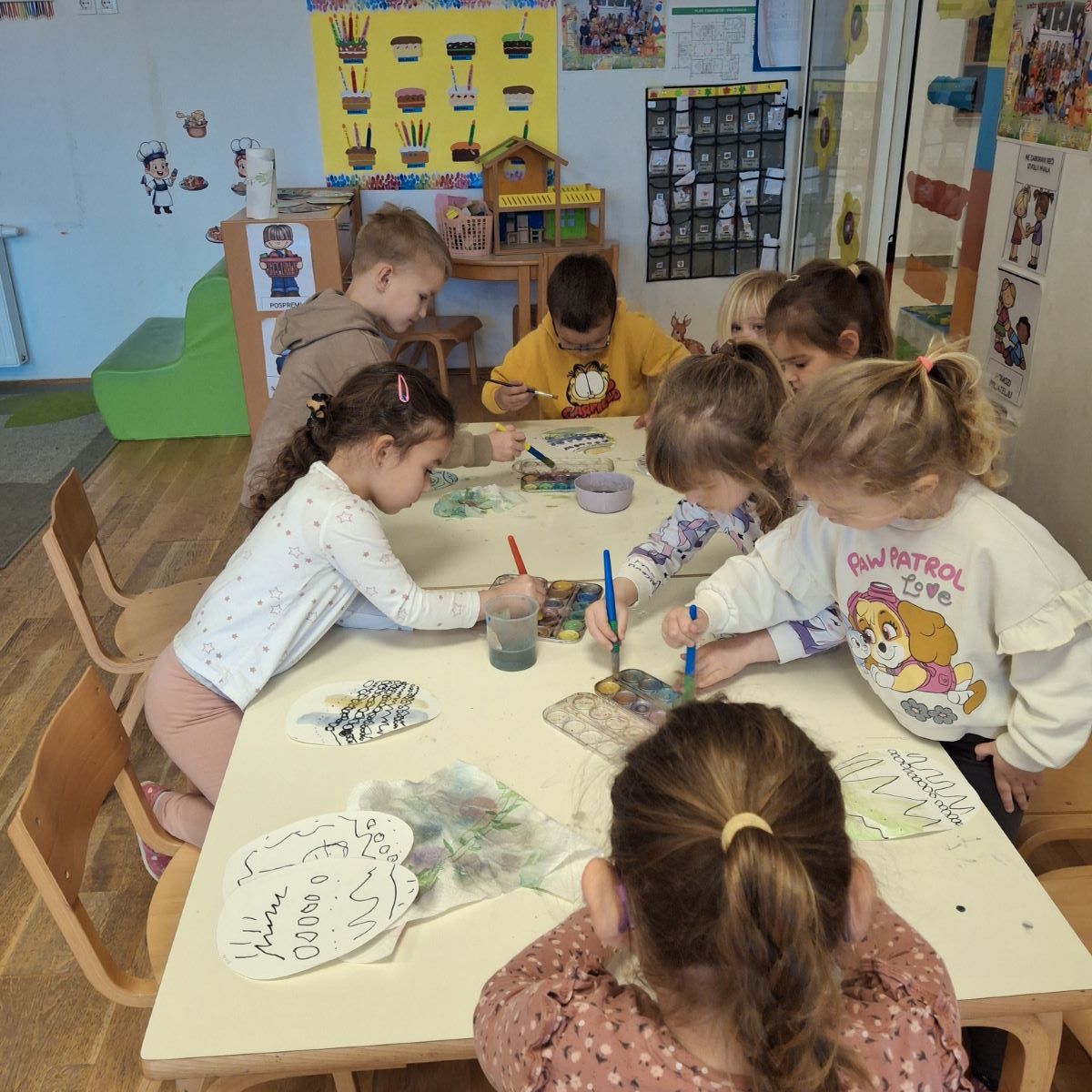 U našoj skupini “Iskrice” proteklo razdoblje bilo je ispunjeno radošću, kreativnošću i veseljem uoči nadolazećeg Uskrsa. Djeca su s velikim zanimanjem sudjelovala u raznim Uskrsnim aktivnostima. Posebno ih je razveselilo bojanje jaja, koja su sami donesli. Ove godine smo se odlučili za bojanje raznobojnim krep papirom koji smo močili u vodu s octom. U likovnom centru okušali smo se i u dekupaž tehnici, razvijajući finu motoriku i osjećaj za estetiku. Kroz radne listove, Iskrice su učvršćivale svoje spoznaje, vježbale pažnju i logičko razmišljanje, dok su kroz razgovor i slikovnice upoznavali običaje vezane za Uskrs.